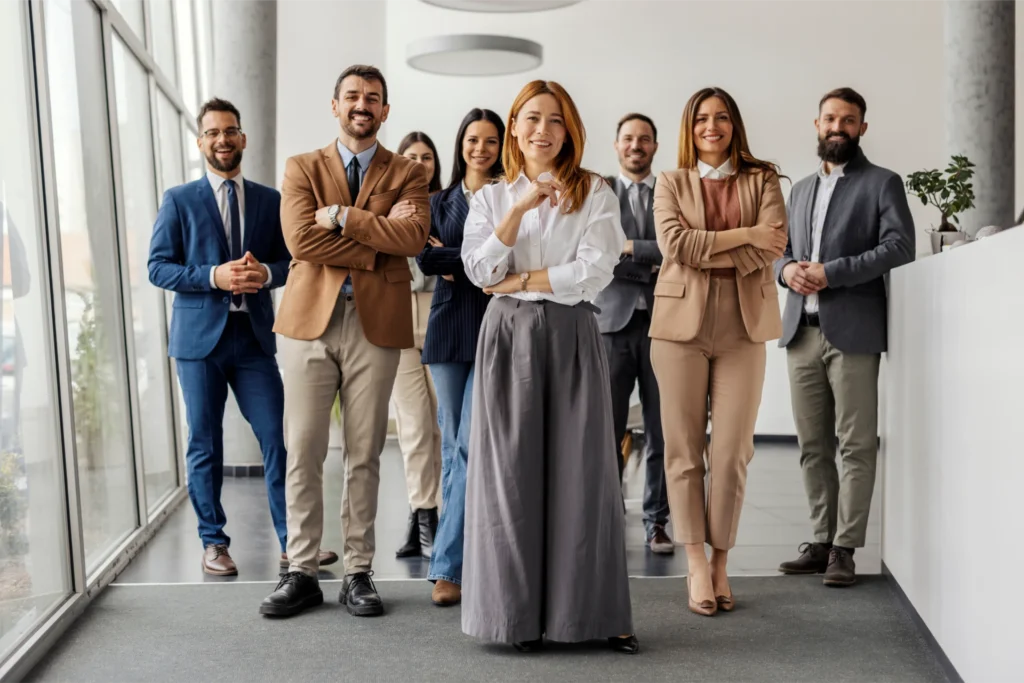 Successful business executive smiling at camera and extending a hand, welcoming or greeting a diverse team of professionals standing confidently in a modern office environment